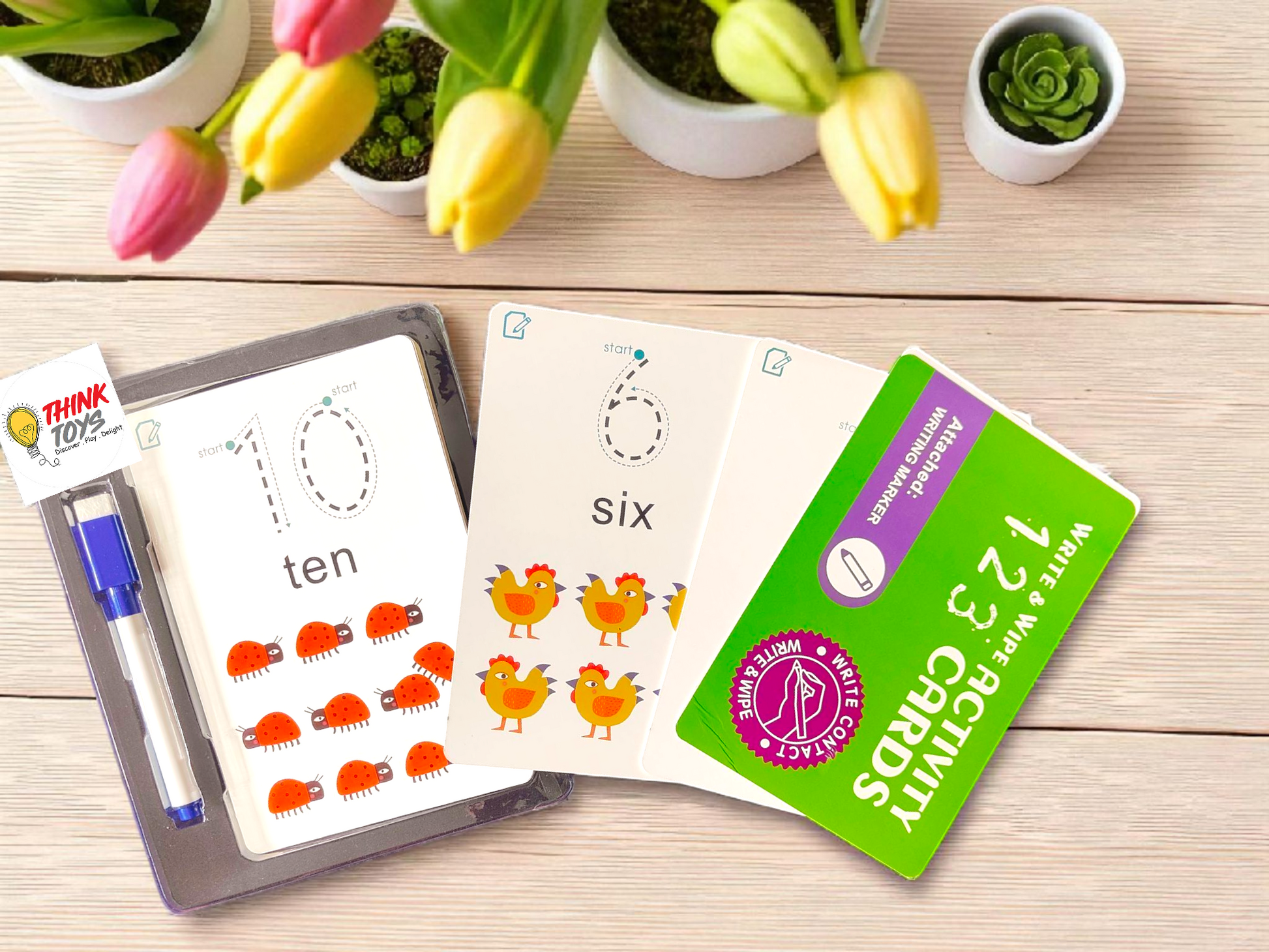 Pack of 2 write and activity cards with 27 cards in each. One to learn numbers and other simple english words.